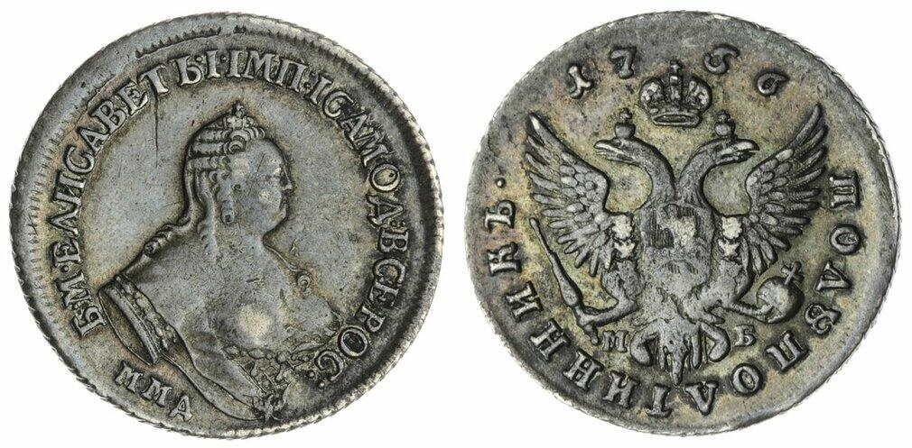 (Tsarist) Russia, Elizabeth Petrovna (1741-1761), Polupoltinnik, 1756-MMA MB, Moscow, M. Bobrovshshikov, crowned, diademed and cuirassed bust right, rev. crowned double-headed eagle, edge obliquely grained, 5.81g, 12h (Sev. 662; Uzd. 0886; Diakov 264; Bitkin 177), toned, about very fine