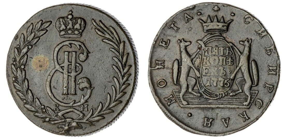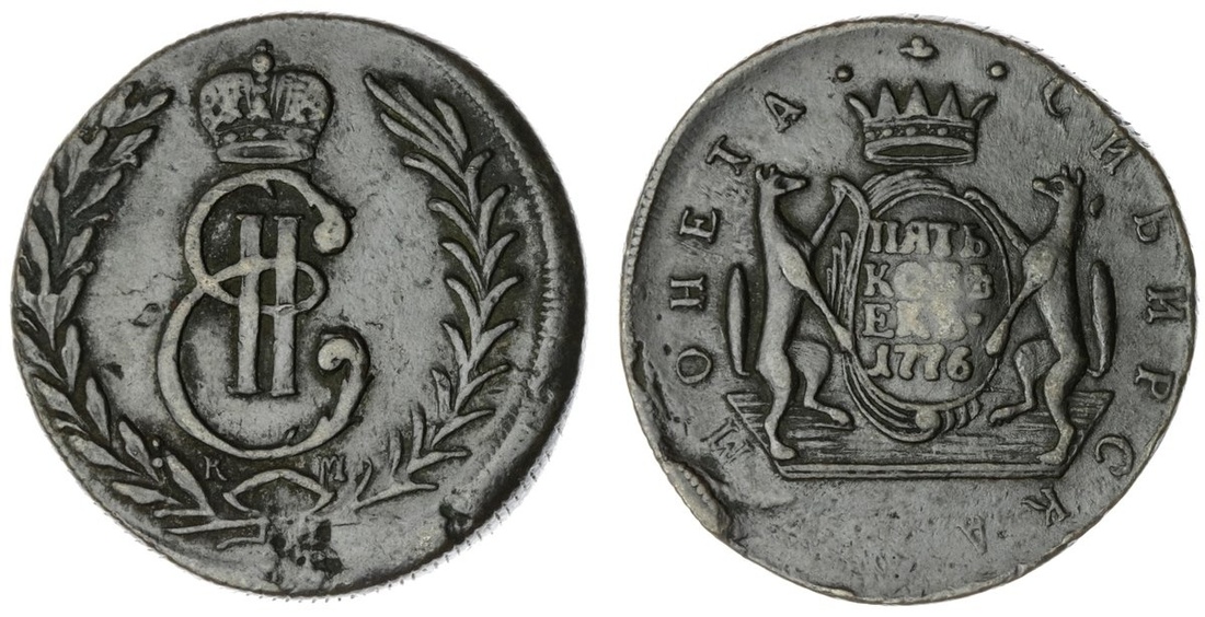 (Tsarist) Russia, Siberia, Catherine II 'Velikaya' (1762-1796), 5-Kopeks, Kolyvan (2), 5-Kopeks, 1775-KM, edge obliquely grained, 31.53g, 12h (Brekke 476; Uzd. 4317; Diakov 335; Bitkin 1076), staining spot, otherwise a bolder very fine; another, 1776-KM, edge obliquely grained, 36.24g, 12h (Brekke 478; Uzd. 4323; Diakov 349; Bitkin 1078), about very fine (2)