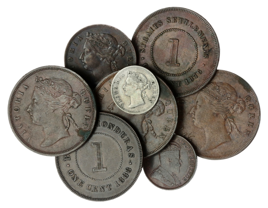 British Colonies (8) | Straits Settlements, Victoria (1837-1901), Cent, 1872; 1874; 1875; 1876, bust left, rev. value within beaded circle, some staining, fine to very fine otherwise; 5 Cents, 1901, crowned bust left, rev. value within beaded circle, very fine; Edward VII (1901-1910), Quarter Cent, 1908, crowned bust right, rev. value within beaded circle, very fine; Mauritius, Victoria (1837-1901) 2 Cents, 1897, crowned bust left, rev. value within beaded circle, very fine; British Honduras, Victoria, Cent, 1888, crowned bust left, rev. value within beaded circle, very fine, almost extremely fine (8)