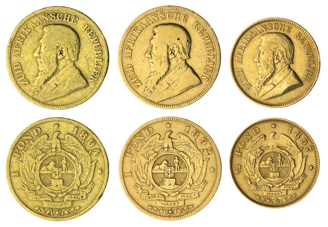 (x) South Africa, Pond, 1892, bust left, rev. double shaft wagon tongue, edge milled, 12h, 7.83g (KM 10.1; Fr 2), heavily cleaned and pock marked to bust, fair to fine; Pond, 1894, bust left, rev. single shaft wagon tongue, edge milled, 12h, 7.76g (KM 10.2; Fr 2), heavily cleaned and contact marked, fair to fine; Half Pond, 1897, bust left, rev. single shaft wagon tongue, edge milled, 12h, 3.97g (KM 9.2; Fr 3) wiped with hints of toning in the legend, otherwise about very fine (3)