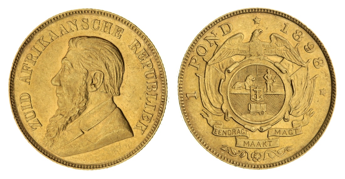 (g) South Africa, Z.A.R, Pond, 1898, bust left, rev. arms, single shaft, milled edge, 12h, 7.98g (Hern's Z51), some very faint contact marks, otherwise with an attractive cartwheel lustre, about uncirculated