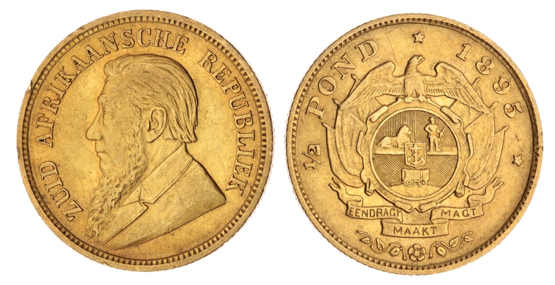 (x) South Africa, Z.A.R., Half-Pond, 1895, Paul Kruger facing left, rev. coat of arms, milled edge, 12h, 3.96g, (KM 9.2), touch of rub to otherwise hazy surfaces, with a light red tone, very fine