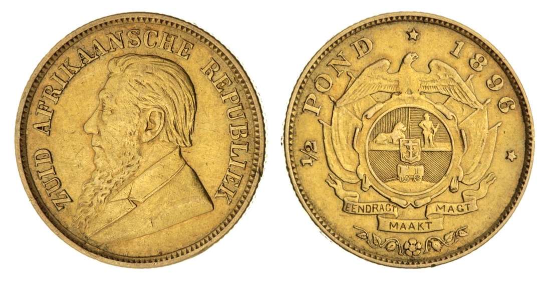 (g) South Africa, Z.A.R. Half-Pond, 1896, bust of Paul Kruger left, rev. Arms, 3.97g, 12h, milled edge, (KM 9.2; Hern's Z42), lightly cleaned, otherwise with some residual lustre to the legends, about very fine