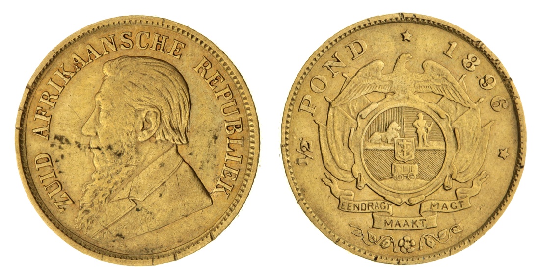 (g) South Africa, Z.A.R. Half-Pond, 1896, bust of Paul Kruger left, rev. Arms, 3.96g, 12h, milled edge, (KM 9.2; Herns Z42), scratched to the obverse and with some dark spots, otherwise with hints of red tone to legends, about very fine