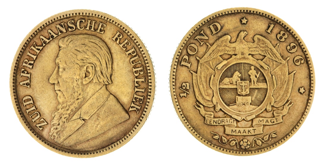 (g) South Africa, Z.A.R. Half-Pond, 1896, bust of Paul Kruger left, rev. Arms, 3.97g, 12h, milled edge, (KM 9.2; Herns Z42), very fine