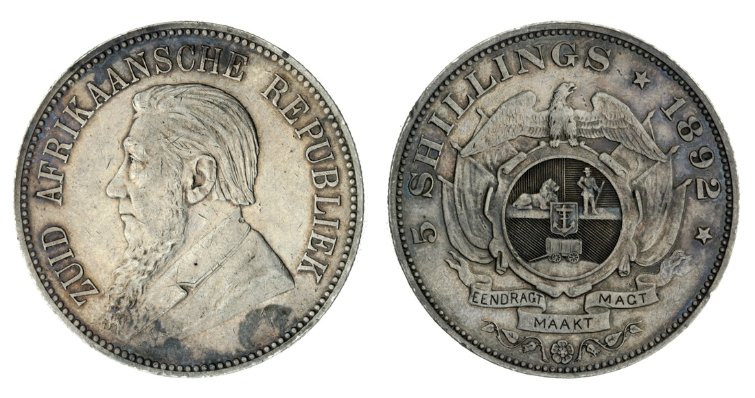 South Africa Z.A.R., 5 Shillings, 1892, single shaft, Paul Kruger bust facing left, rev. Arms, 28.23g, 12h, milled edge, (KM 8.2; Herns Z37), the obverse bagmarked and previously wiped, yet cabinet toned, very fine