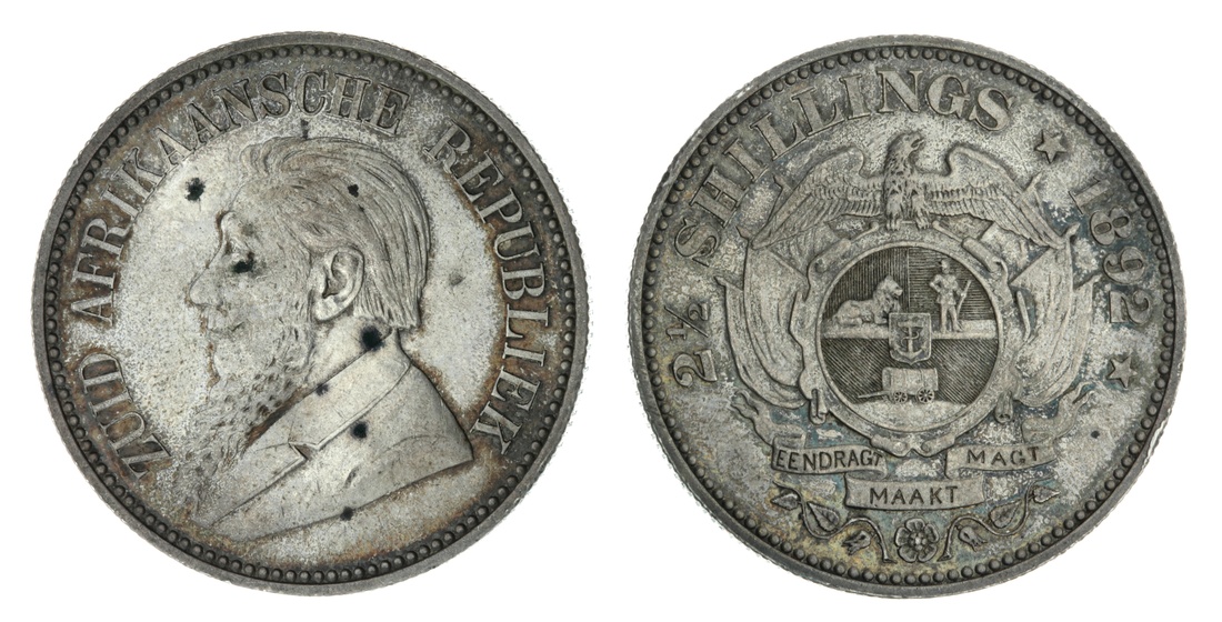 South Africa, Z.A.R., Two and Half Shillings, 1892, bust left, rev. arms, single shaft, milled edge, 12h, 14.13g (Hern's Z30), some very faint contact marks to obvers and spots of verdigris, otherwise cabinet toned, very fine, scarce