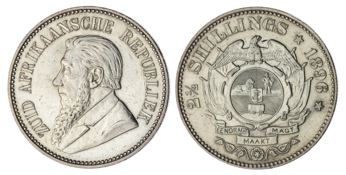 (x) South Africa, Z.A.R., Halfcrown of 2 ½-Shillings 1896, ZUID AFRIKAANSCHE REPUBLIEK, bearded and draped bust of President Johannes Paulus Kruger left, rev. 5 SHILLINGS * 1896 * EENDRAGT MAAKT MAGT, Arms of the South African Republic below denomination and date, double-shaft type, edge milled, 12h (KM 7), bright polished and occasionally bagmarked, otherwise residually lustrous, a really bold very fine