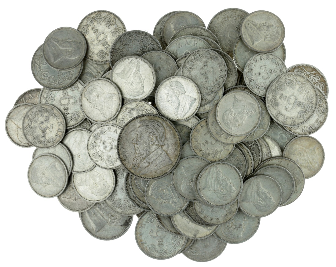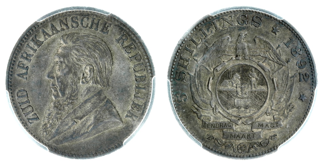 (x) Collection of South African Silver (150) | South Africa, PCGS AU55, 5 Shillings, 1892, bare head left, rev. single shaft wagon tongue, 12h, edge milled (KM 8.1), few negligible marks in the fields, otherwise very fine, in PCGS holder, graded AU55 (Cert. 560701.55/35514869); Shilling, 1897, bare head left, rev. denomination within wreath and bow, 11h, edge milled (KM 5) light bagmarking, nonetheless about very fine; Sixpence, 1892 (5), 1893 (8), 1894 (6), 1895 (5), 1896 (29), 1897 (17), in a mix of conditions, mostly very fine; Threepence, 1892 (8), 1893 (12), 1894 (9), 1895 (7), 1896 (26), 1897 (16), in a mix of conditions, mostly very fine (150)