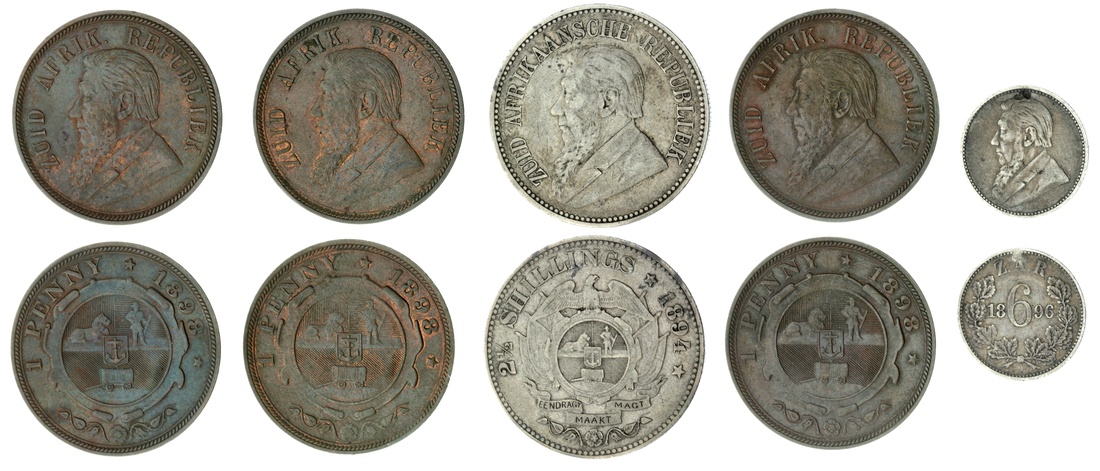 South Africa, Z.A.R. Silver and Bronze Coins (5) | Two and Half Shilling, 1894, Paul Kruger bust facing left, rev. Arms, 13.99g, 12h, milled edge, (Herns Z32), some contact marks, bolder fine; Sixpence, 1896, Paul Kruger bust only facing left, rev. denomination and date within wreath, 14g, 12h, milled edge, (Herns Z15), small plugged hole above bust, deep tone, fine; Penny, 1898 (3), Paul Kruger bust facing left, rev. Arms, plain edge, (Herns Z4), two with hints of original mint red to the edge of devices, very fine to about extremely fine (5)