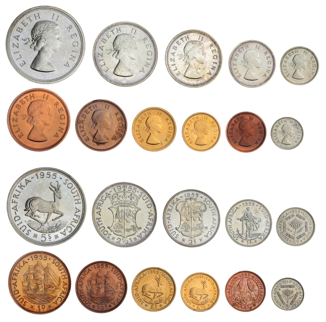 (g) South Africa, Elizabeth II (1952-2022), Proof Nine Coin Set, 1955, Gold Rand and Half Rand; Silver 50 Cents to Two and a Half Cents; Brass Cent to Half Cent, (KM PS33), brilliant, as struck, in original case of issue (9)