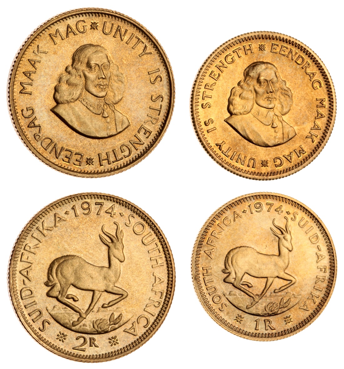 (g) South Africa, Proof Two Coin Set, Gold Two Rand to Gold Rand, 1974, bust facing right, rev. springbok facing right, milled edge, 7.98g; 3.98g (KM PS92), brilliant and as struck, in Royal Mint case of issue (2)