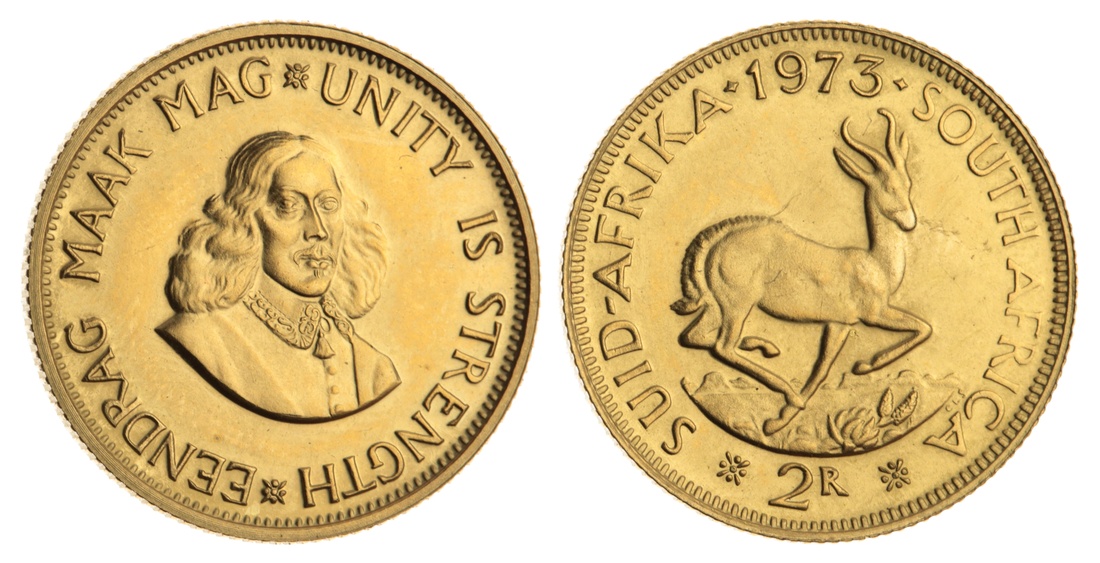 (x) South Africa, Proof Two Rand, 1973, springbok, rev. bust of Jan van Riebeeck right, edge milled, 12h, 8.03g (KM 64; Fr 11), surfaces lightly fingermaked, otherwise brilliant beneath, about extremely fine