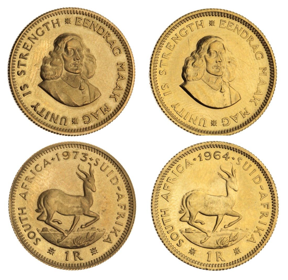 (x) South Africa, Rand, 1964, springbok, rev. bust of Jan van Riebeeck right, edge milled, 12h, 4.03g (KM 63; Fr 12), very lightly hairlined and fingermarked, otherwise with proof-like surfaces, near extremely fine; Proof Rand 1973, springbok, rev. bust of Jan van Riebeeck right, edge milled, 12h, 4.00g (KM 63; Fr 12) fingermarked, yet brilliant beneath and lightly toned, about extremely fine (2)