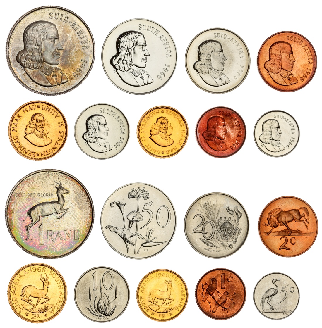 (g) South Africa, Proof Nine Coin Set, 1966, Gold Two Rand and Gold Rand; Silver Rand; Fifty Cents to One Cent (Hern P40; KM PS66), the Silver Rand with much cabinet toning, all with much mint lustre and practically as struck, in original South Africa Mint case (9)