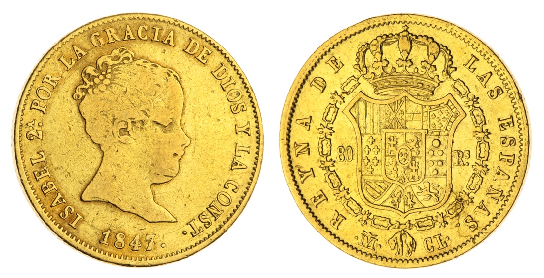 (g) Spain, Isabella II (1833-1868), 80-Reales, 1847 M, Madrid, obliquely milled edge, 12h, 6.70g (Fr 325; KM 578.2), cleaned and contact marked, fine, yet the reverse better