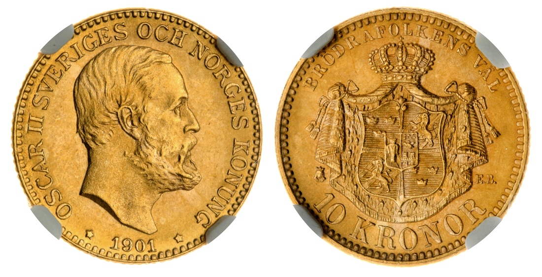 (g) NGC MS66 | Sweden, Oscar II (1872-1907), Gold 10-Kronor, 1901 EB, milled edge, 12h (Fr 94b; KM 767), with an attractive cartwheel lustre, practically as struck