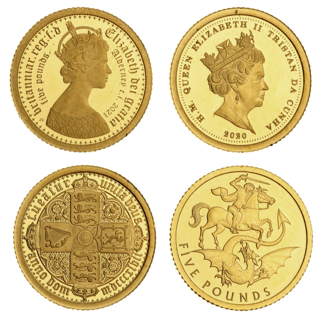 (g) Tristan da Cunha, Elizabeth II (1952-2022), Proof Gold Five-Pounds, crowned bust right, rev. St George and dragon, milled edge, 11h, 0.51g, brilliant as struck; Alderney, Elizabeth II (1952-2022), Proof Gold Five-Pounds, 'Gothic' crowned bust right, rev. crowned cruciform shields, milled edge, 12h, 0.50g, brilliant as struck
