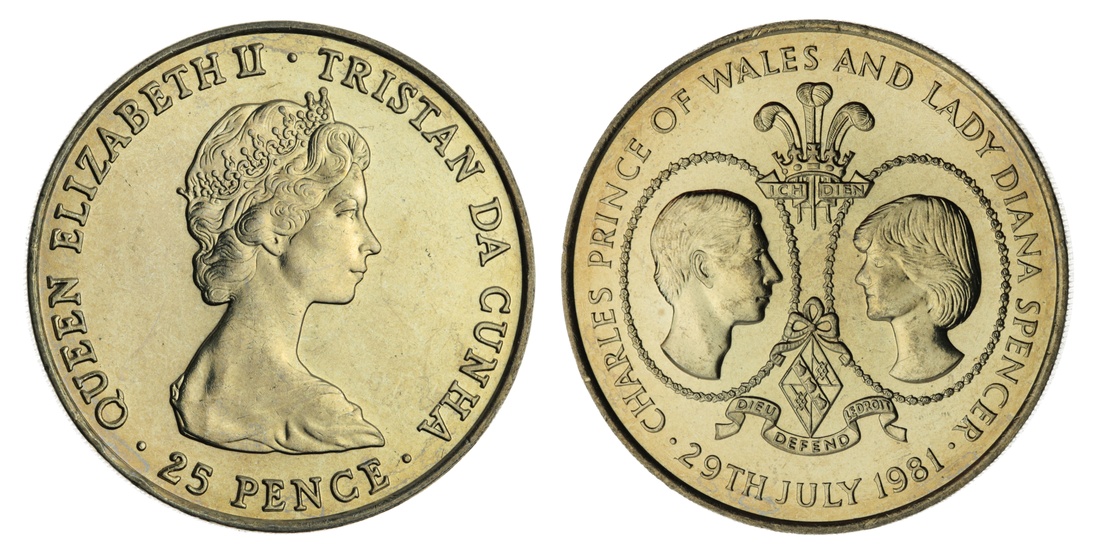 Tristan da Cunha, Elizabeth II (1952-2022), 25 Pence 'Marriage of Prince of Wales and Lady Diana Spencer', 1981, crowned bust right, rev. facing busts within floral wreaths, surmounted by Prince of Wales plumes, milled edge, 12h, 28.34g (KM 4), some contact marks, otherwise lustrous, extremely fine