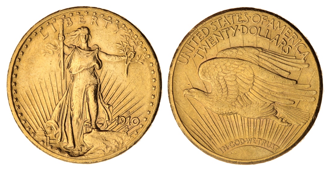 (x) United States of America, 'St Gaudens' Double Eagle of Twenty-Dollars, 1910 S $20, San Francisco, Liberty standing rev. "IN GOD WE TRUST" under eagle, lettered edge, 6h, 33.42g (KM 131), cleaned and with some faint contact marks, yet hints of red toning, very fine