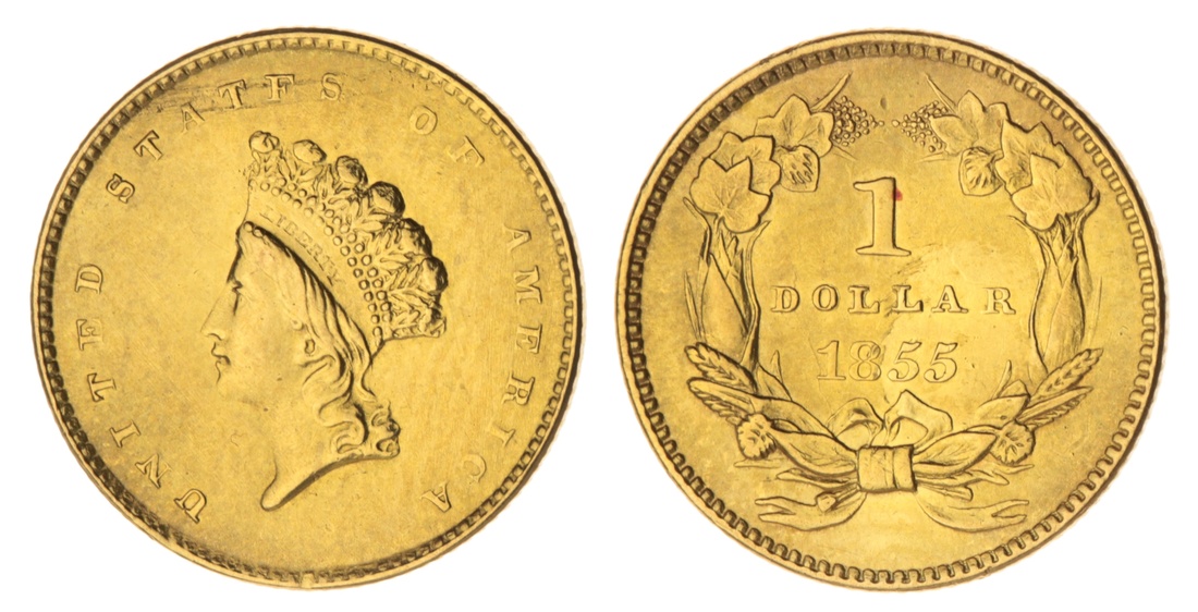 (g) United States of America, USA, 'Indian Princess Head' Gold Dollar, 1855 G$1, 'Slanting 5', Type 2, Philadelphia, Liberty head, with feather head-dress left, rev. denomination and date within wreath, milled edge, 1.65g, 6h (PCGS 7532; NGC ID: 25C4; Breen 6040; KM 83; Fb. 92), lightly cleaned and subtly creased, otherwise struck details a bolder very fine, scarce