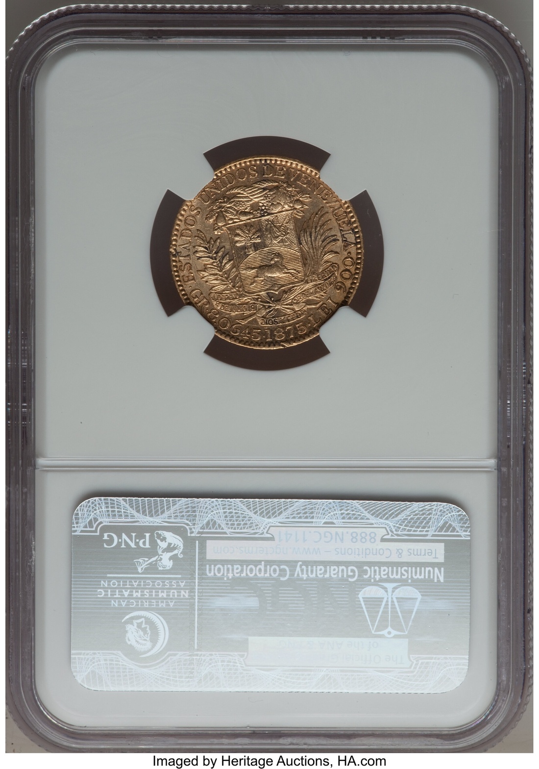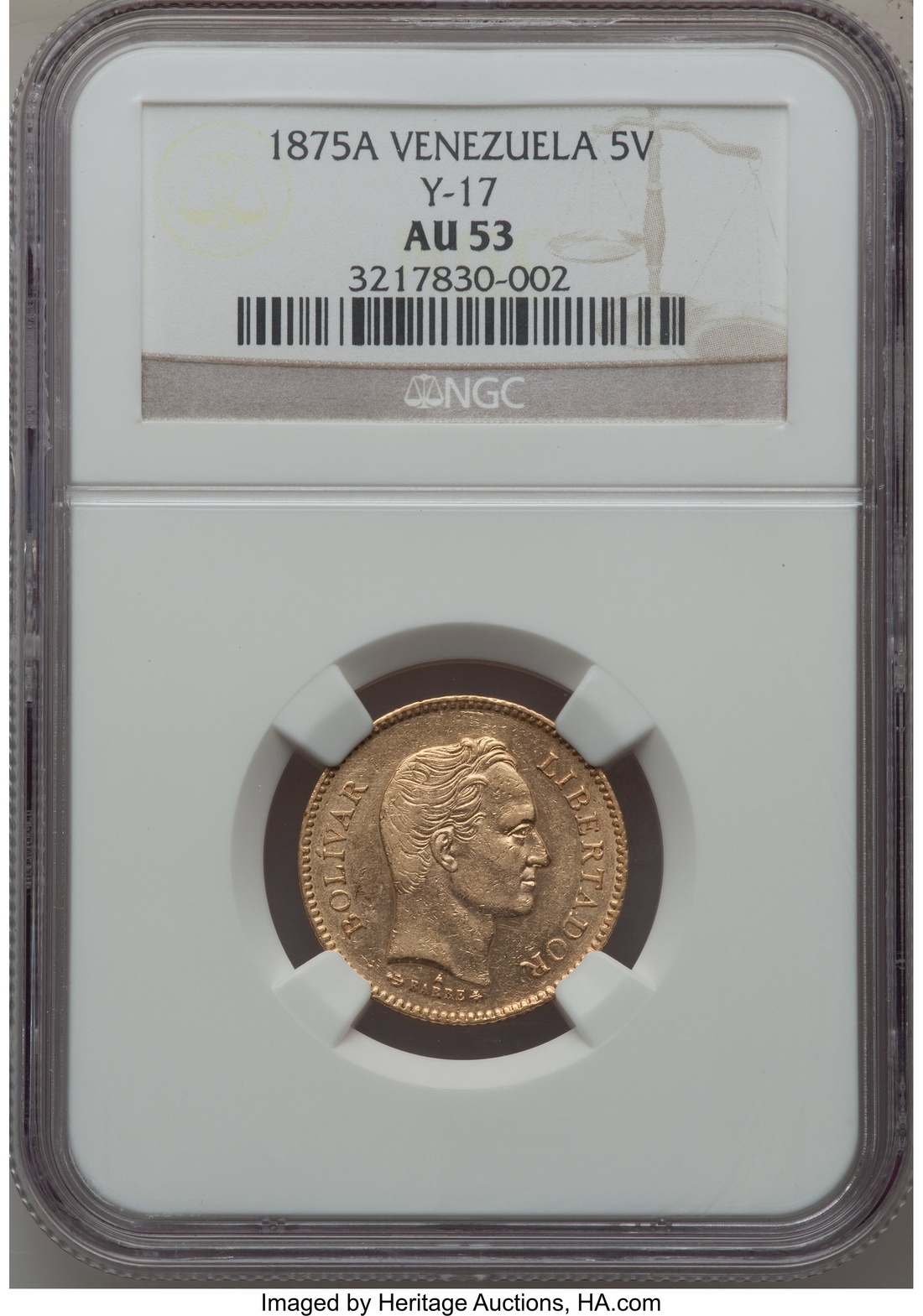 (g) NGC AU53 | Venezuela, Gold 5-Venezolanos, 1875-A, Paris, •ESTADOS UNIDOS DE VENEZUELA•