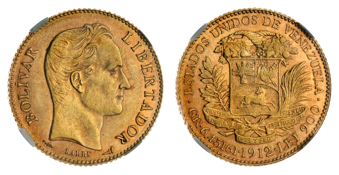 (g) NGC MS62 | Venezuela, Gold 20-Bolívares, 1912-A, Paris, •ESTADOS UNIDOS DE VENEZUELA•