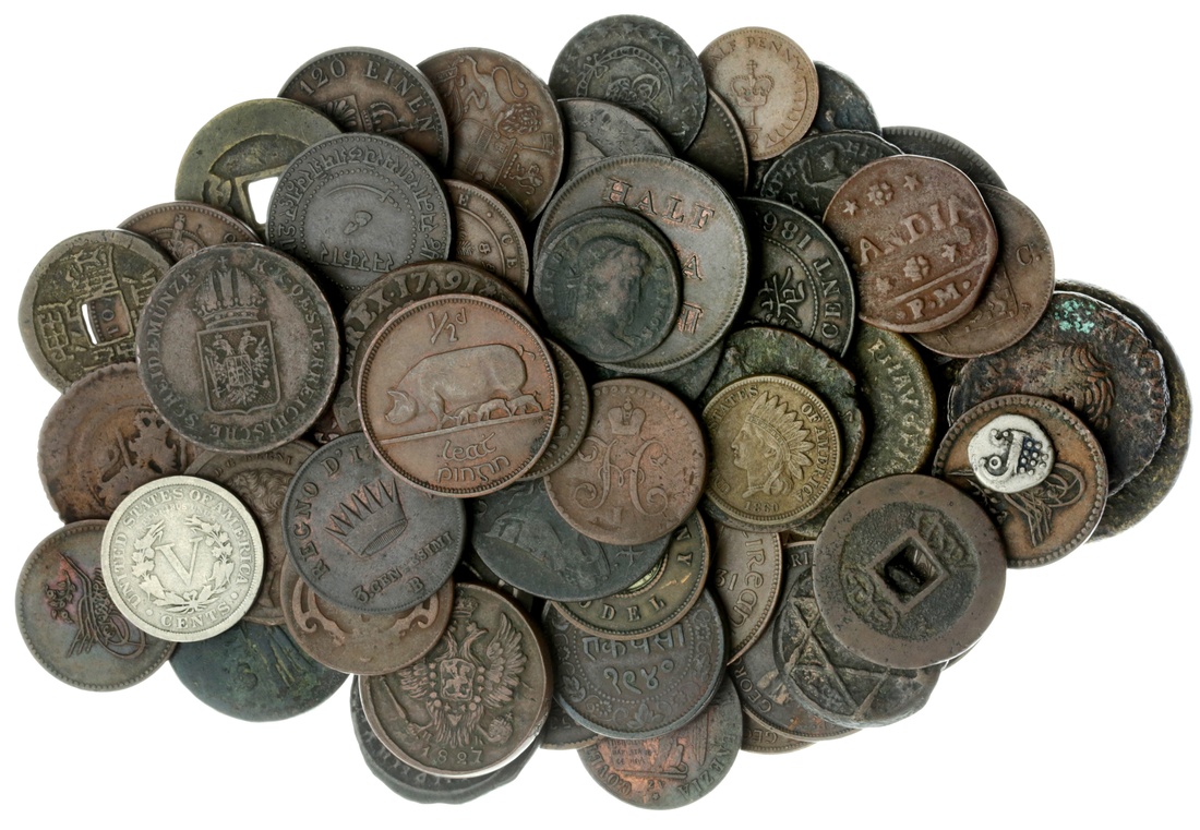 World and Ancient Silver, Copper and Bronze Coins (107) | including George III (1760-1820), Halfpenny, 1770; India, East India Company, Quarter Anna, 1835; Denmark, Christian IX (1863-1906), 5 Ore, 1874; Russia, Catherine II (1762-1796), Denga, 1738; alongside, an array of ancient, medieval Indian and Islamic and milled world coins, from fine to very fine (107)