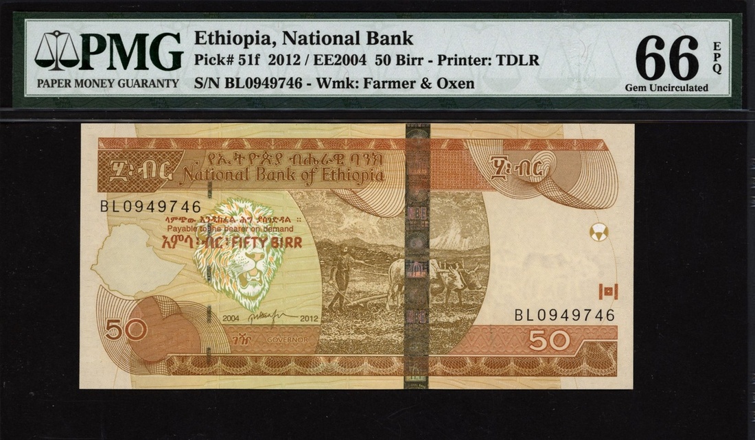 (x) National Bank of Ethiopia, 50 birr, 2012, serial number BL0949746, (Pick 51f), in PMG holder 66 EPQ Gem Uncirculated