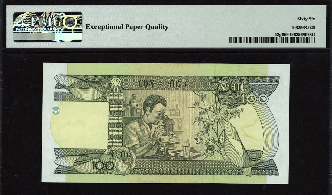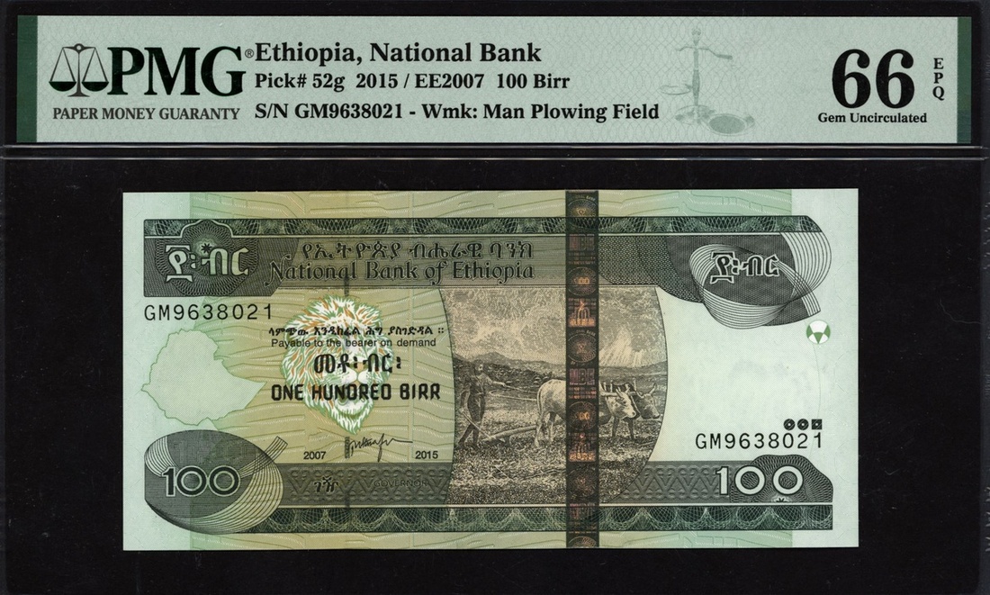 (x) National Bank of Ethiopia, 100 birr, 2015, serial number GM9638021, (Pick 52g), in PMG holder 66 EPQ Gem Uncirculated