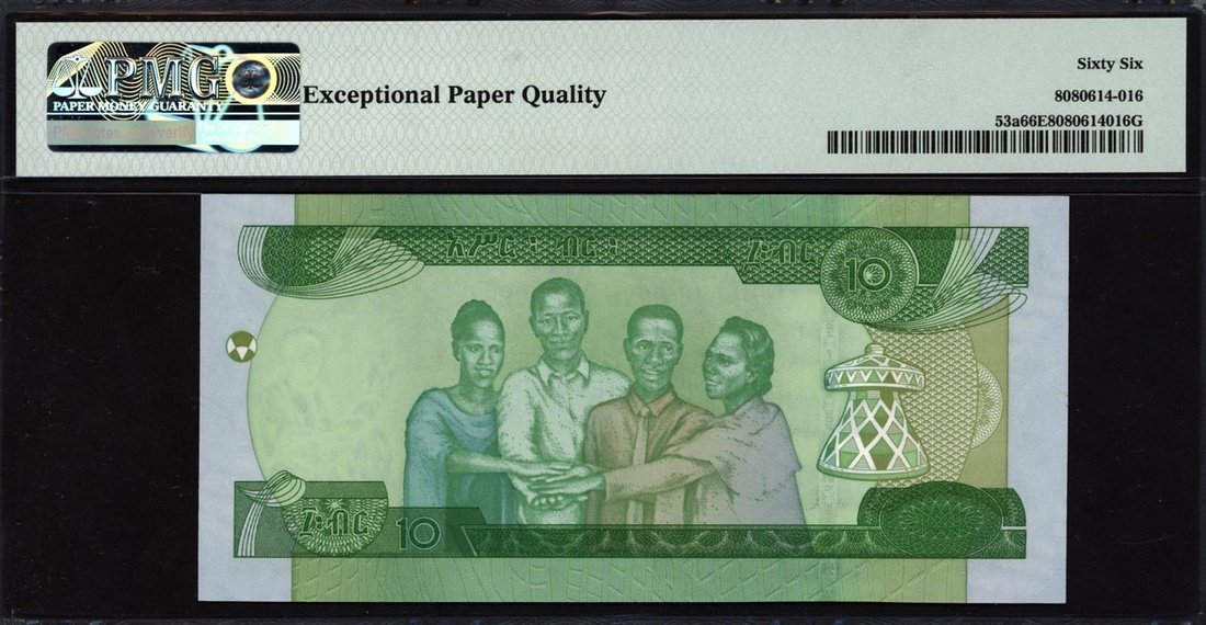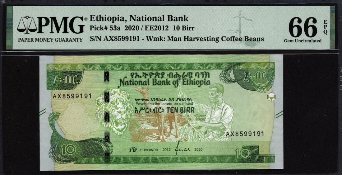 (x) National Bank of Ethiopia, 10 birr, 2020, serial number AX8599191, (Pick 53a), in PMG holder 66 EPQ Gem Uncirculated