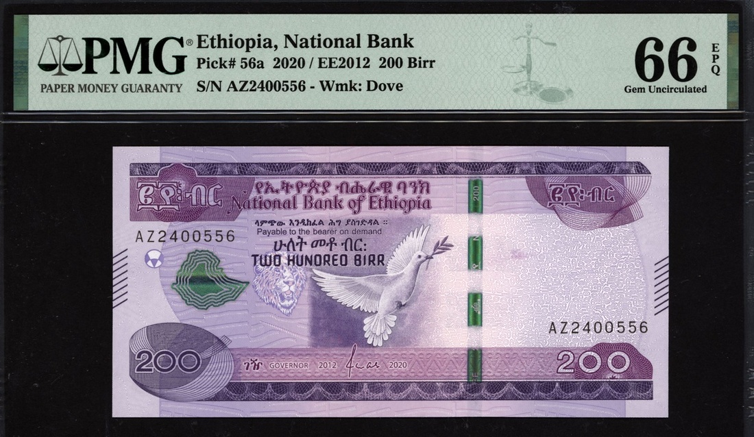(x) National Bank of Ethiopia, 200 birr, 2020, serial number AZ2400556, (Pick 56a), in PMG holder 66 EPQ Gem Uncirculated