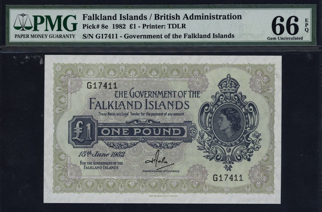 (x) The Government of Falkland Islands £1, 1982, serial number G17411, (Pick 8e), in PMG holder 66 EPQ Gem Uncirculated