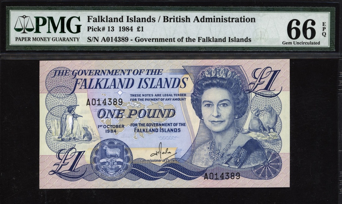 (x) The Government of Falkland Islands, £1, 1984, serial number A014389, (Pick 13), in PMG holder 66 EPQ Gem Uncirculated