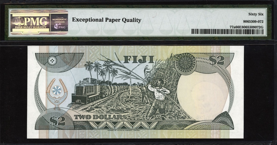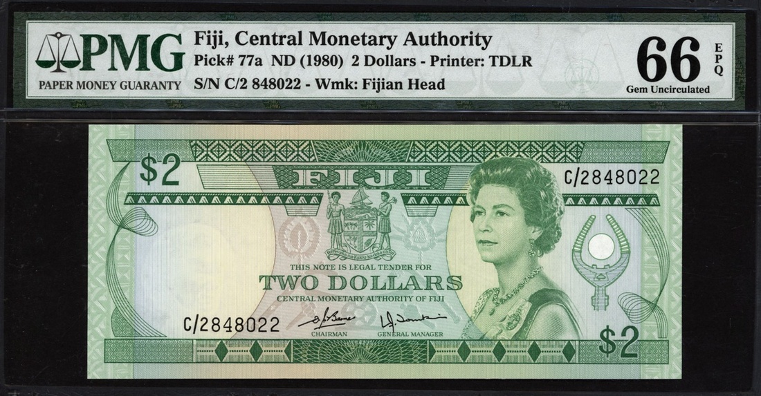 (x) Central Monetary Authority of Fiji, 2 dollars, ND (1980), serial number C/2 848022, (Pick 77a), in PMG holder 66 EPQ Gem Uncirculated
