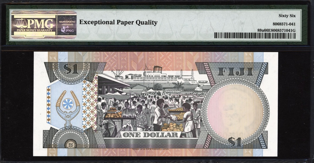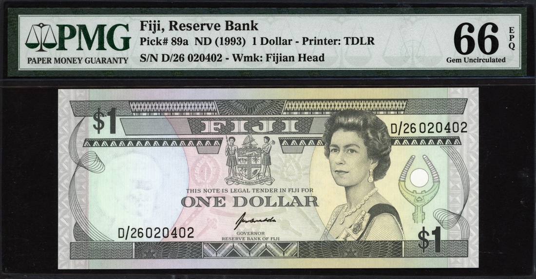 (x) Reserve Bank of Fiji, 1 dollar, ND (1993), serial number D/26 020402, (Pick 89a), in PMG holder 66 EPQ Gem Uncirculated