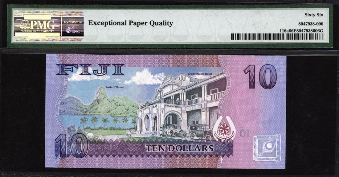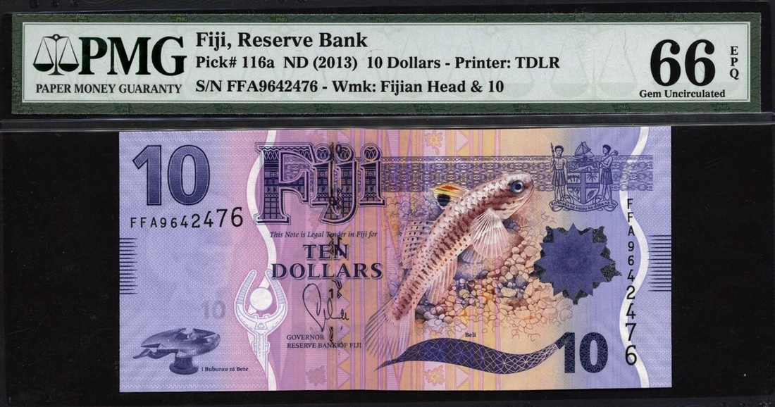(x) Reserve Bank of Fiji, 10 dollars, ND (2013), serial number FFA9642476, (Pick 116a), in PMG holder 66 EPQ Gem Uncirculated