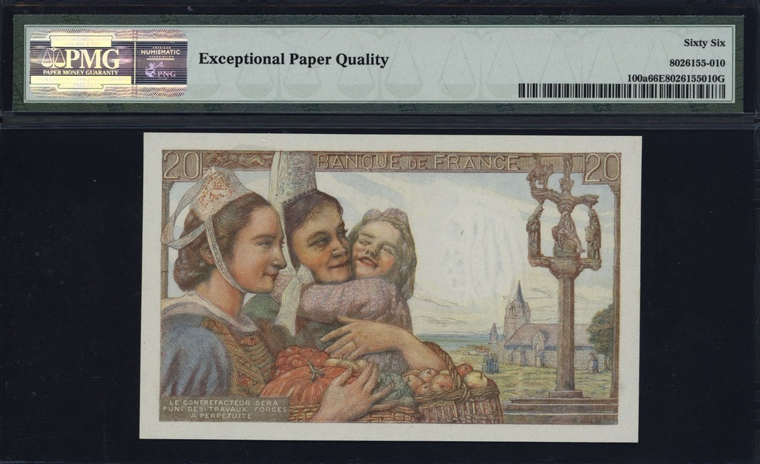 (x) Banque de France, 20 francs, 1943, serial number V.103 42129, (Pick 100a), in PMG holder 66 EPQ Gem Uncirculated