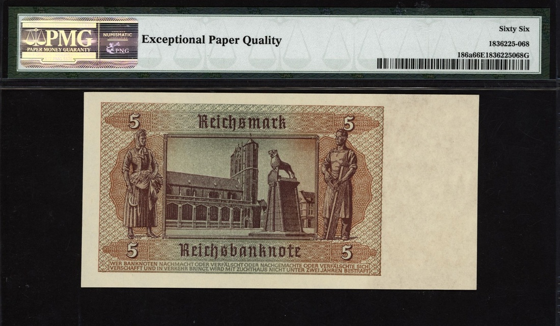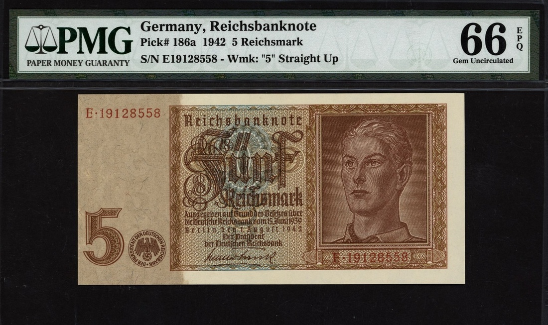 (x) Reichsbanknote, Germany, 5 reichsmark, 1942, serial number E19128558, (Pick 186a), in PMG holder 66 EPQ Gem Uncirculated