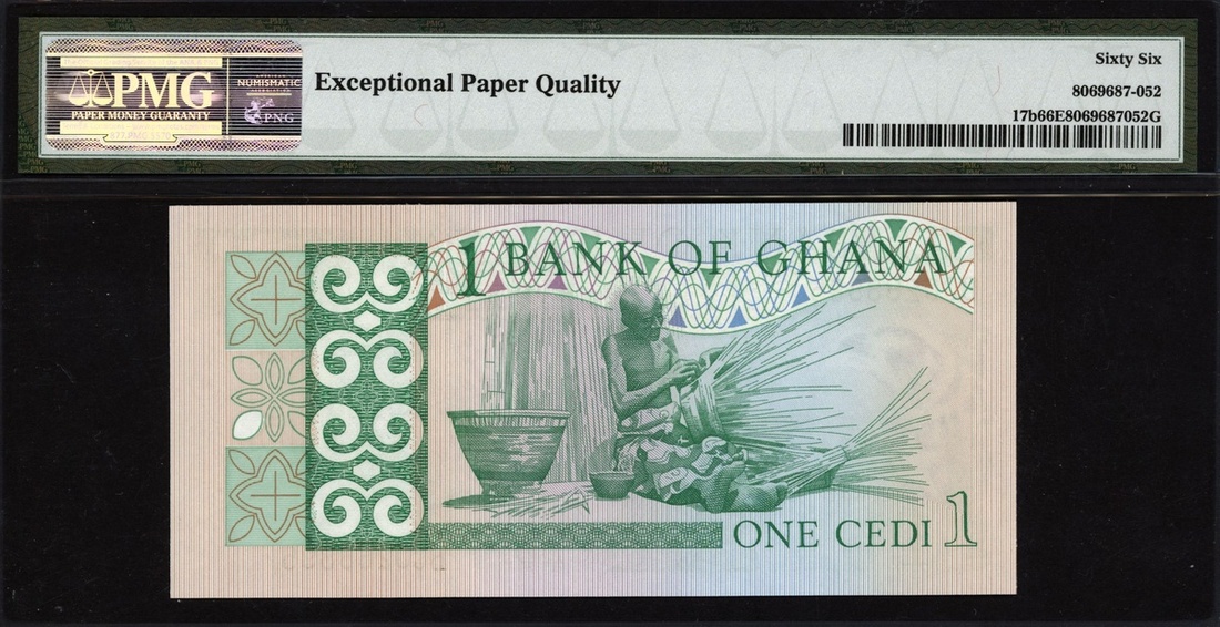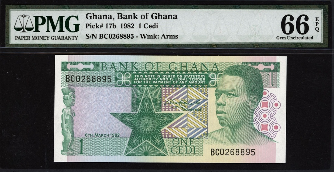 (x) Bank of Ghana, 1 cedi, 1982, serial number BC0268895, (Pick 17b), in PMG holder 66 EPQ Gem Uncirculated