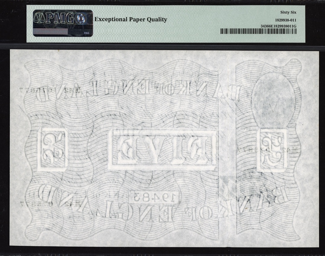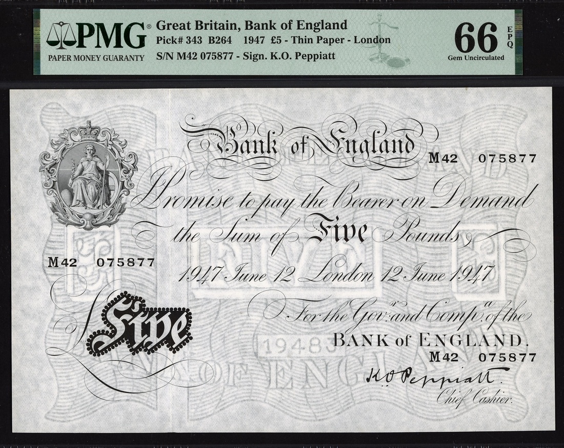 Bank of England, K.O. Peppiatt, £5, London, 12 June 1947, serial number M42 075877, (EPM B264, Pick 343), M last prefix, in PMG holder 66 EPQ Gem Uncirculated. Only 1 higher grade example on PMG Census