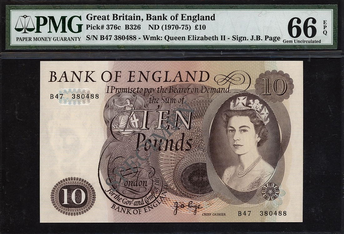 (x) Bank of England, J.B. Page, £10, ND (1970-75), serial number B47 380488, (EPM B326, Pick 376c), in PMG holder 66 EPQ Gem Uncirculated