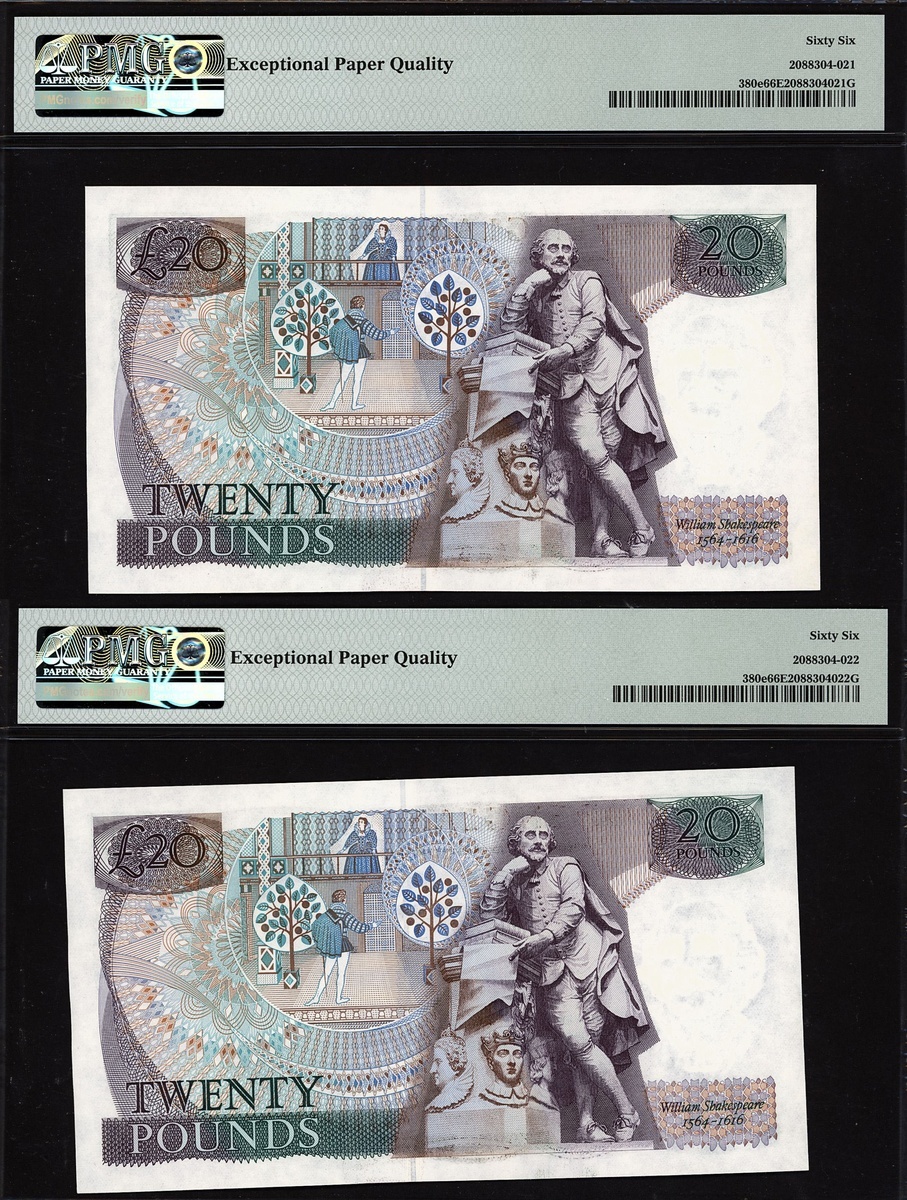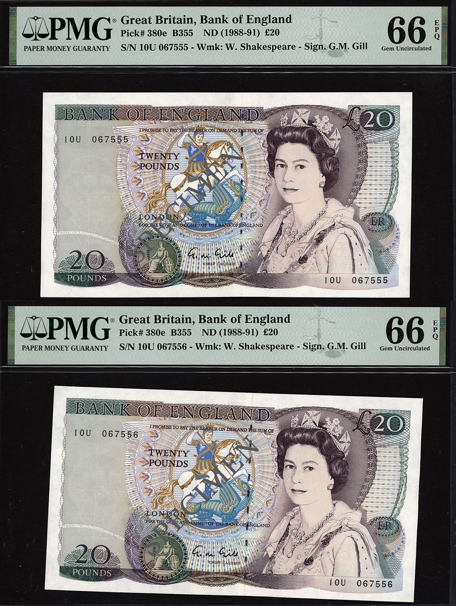 (x) Bank of England, G.M. Gill, consecutive pair of £20, ND (1988-91), serial numbers 10U 067555/56, (EPM B355, Pick 380e), interesting 'IOU' prefix, both in PMG holders 66 EPQ Gem Uncirculated (2 notes)