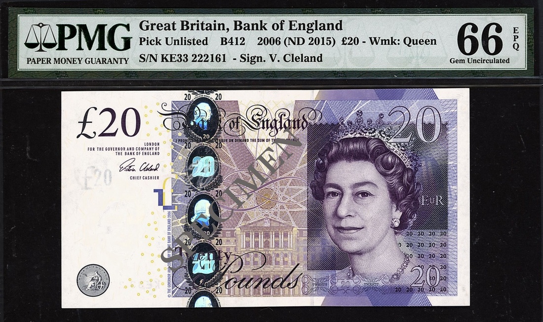 (x) Bank of England, V. Cleland, £20, 2006 (ND 2015), serial number KE33 222161, (EPM B412, Pick unlisted), in PMG holder 66 EPQ Gem Uncirculated