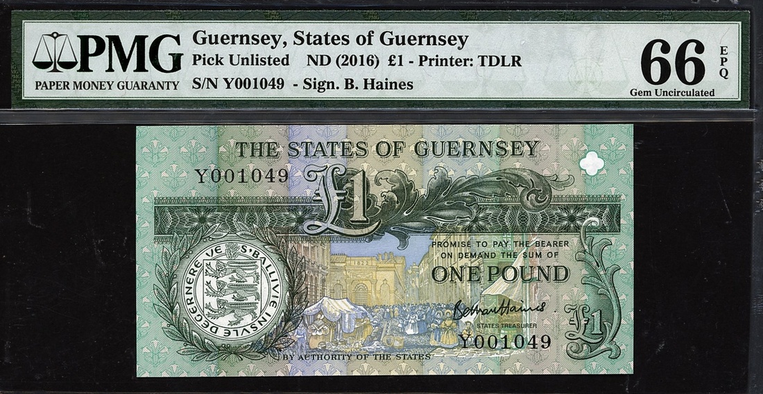 (x) The States of Guernsey, £1, ND (2016), serial number Y001049, (Pick Unlisted), in PMG holder 66 EPQ Gem Uncirculated