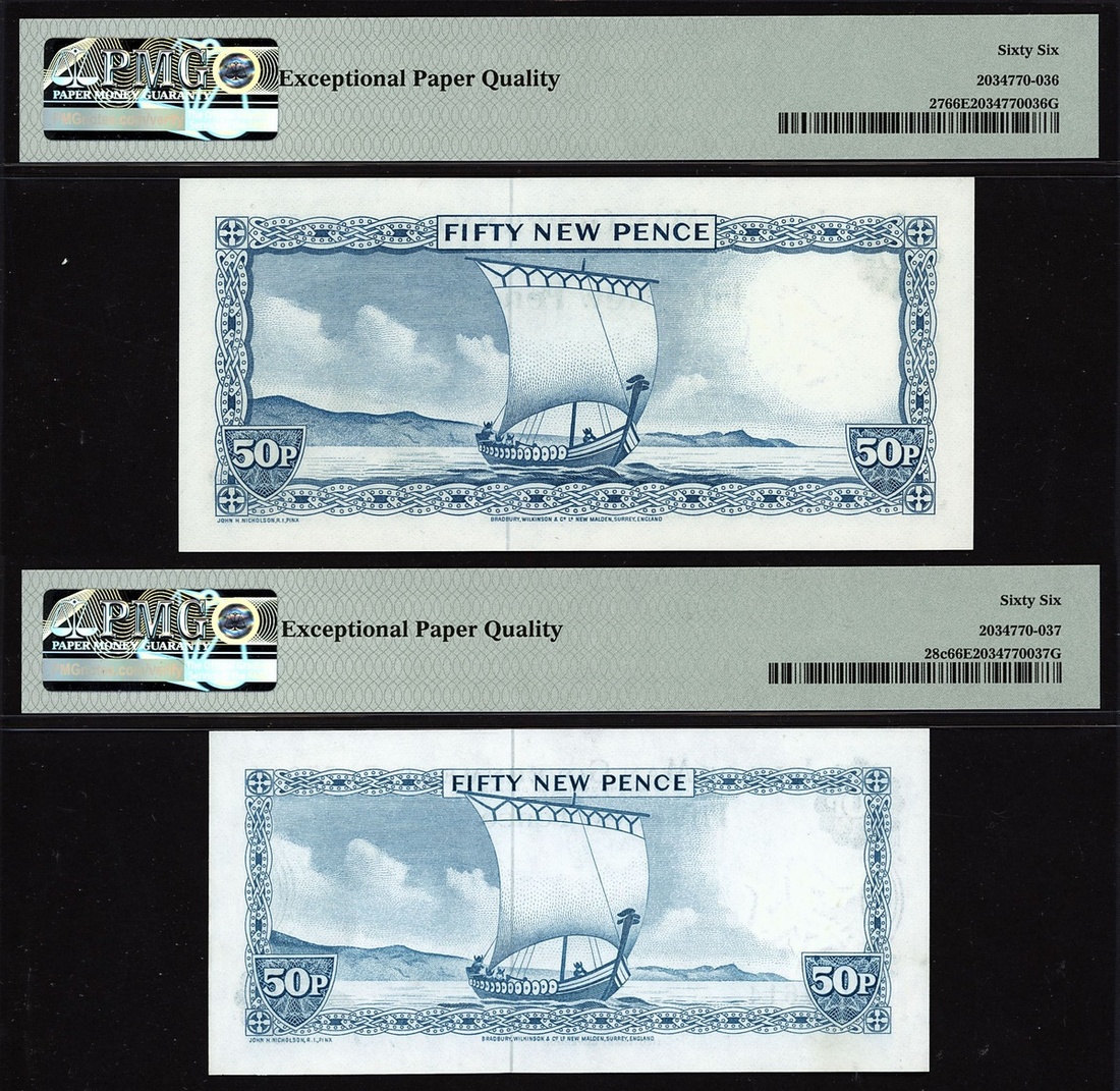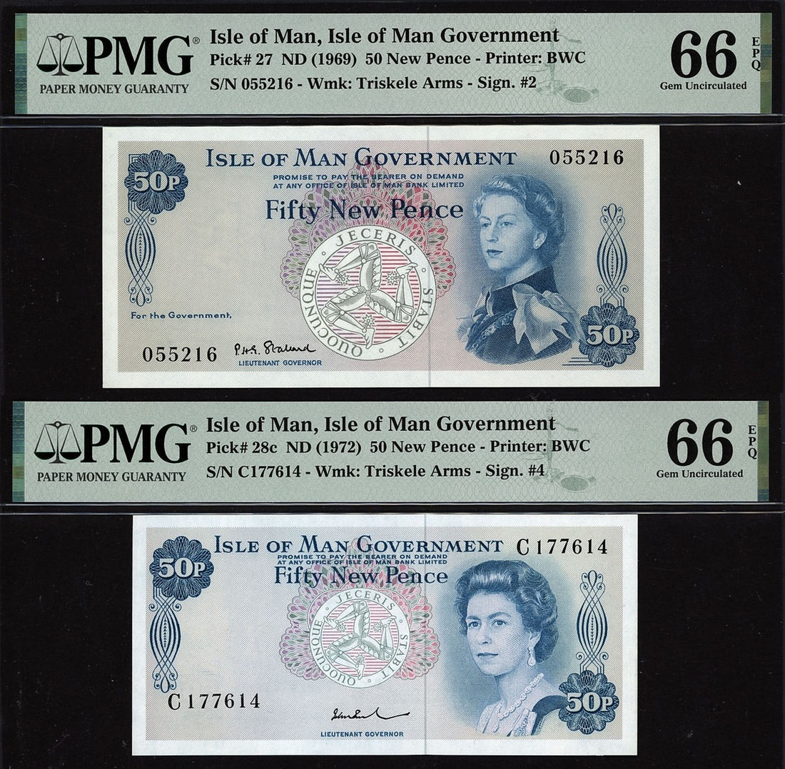 (IOMPM M507, M514, Pick 27, 28c), both in PMG holders 66 EPQ Gem Uncirculated (2 notes)