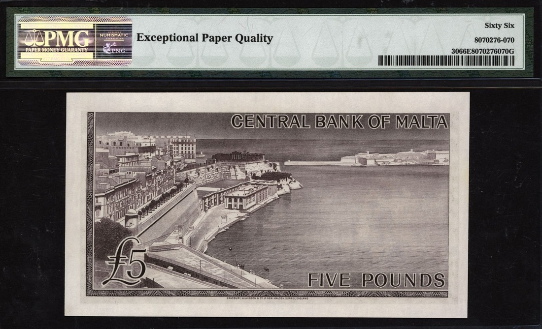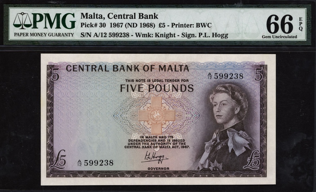 (x) Central Bank of Malta, £5, 1967 (ND 1968), serial number A/12 599238, (Pick 30), in PMG holder 66 EPQ Gem Uncirculated