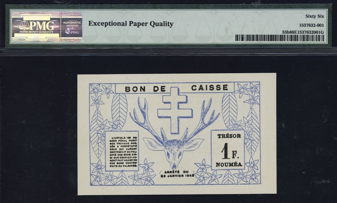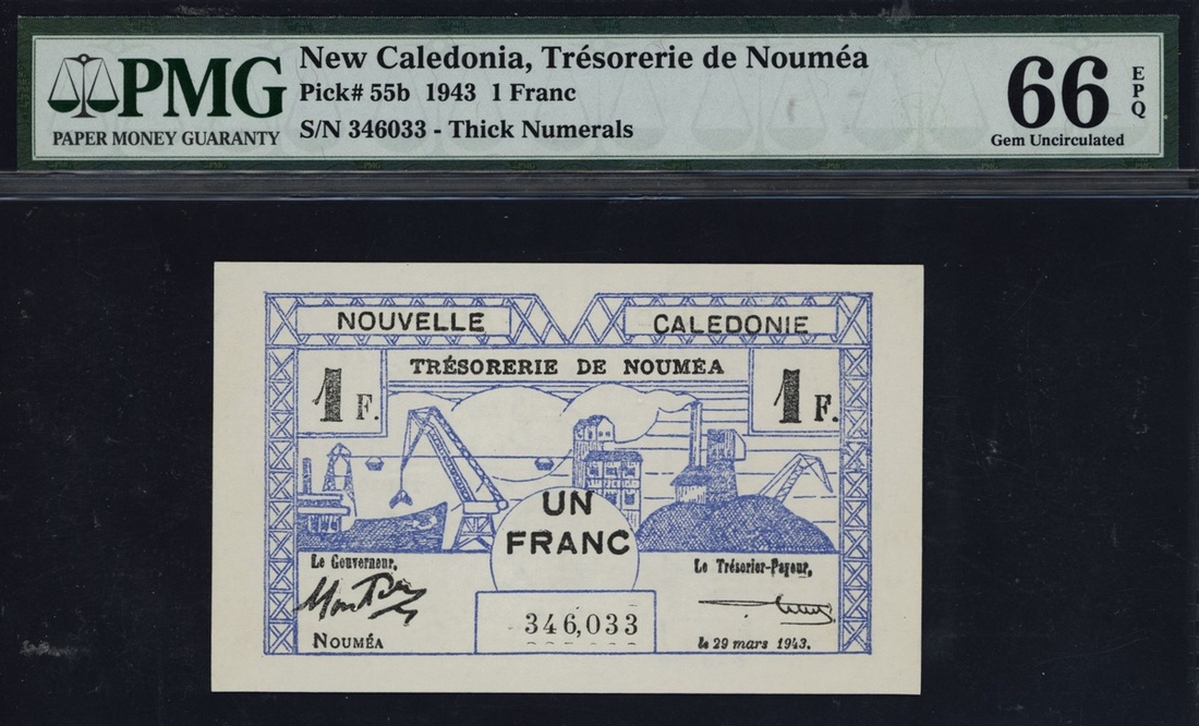 (x) Tresorerie de Noumea, New Caledonia, 1 franc, 1943, serial number 346033, (Pick 55b), in PMG holder 66 EPQ Gem Uncirculated
