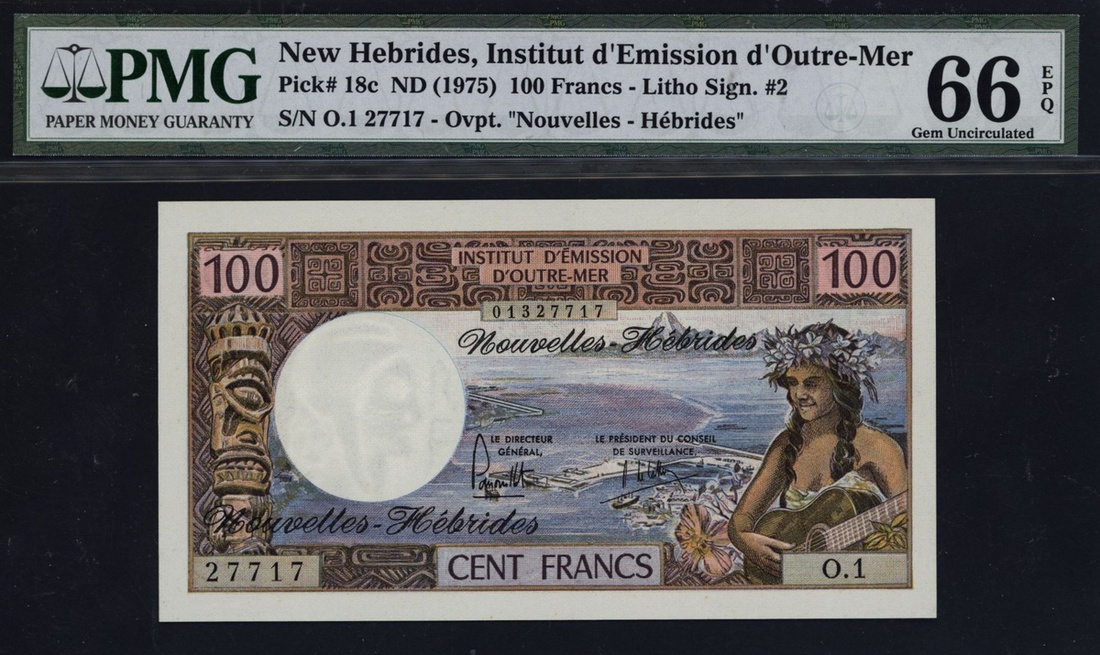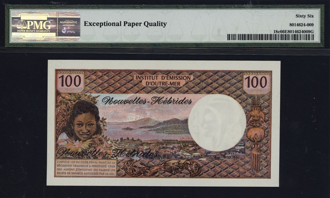 (x) Institut d'Emission d'Outre-Mer, New Hebrides, 100 francs, ND (1975), serial number 0.1 27717, (Pick 18c), in PMG holder 66 EPQ Gem Uncirculated