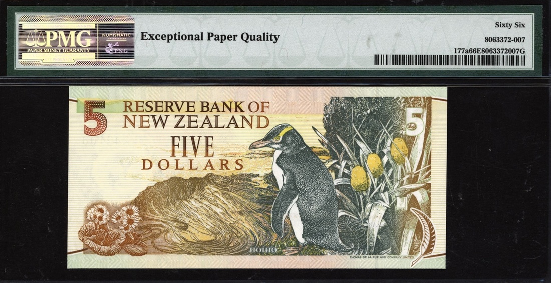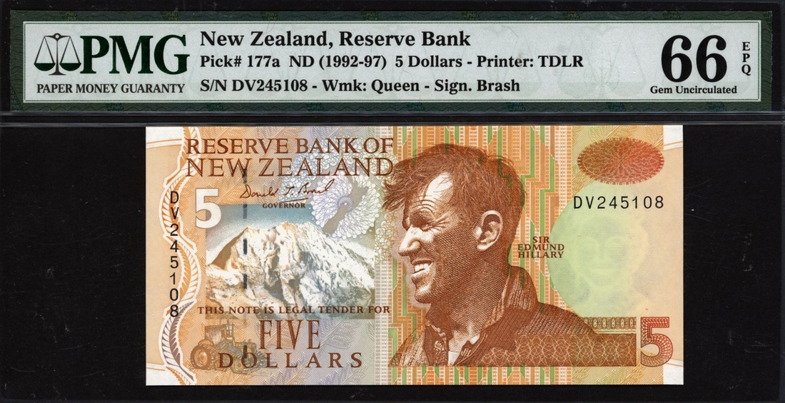 (x) Reserve Bank of New Zealand, 5 dollars, ND (1992-97), serial number DV245108, (Pick 177a), in PMG holder 66 EPQ Gem Uncirculated